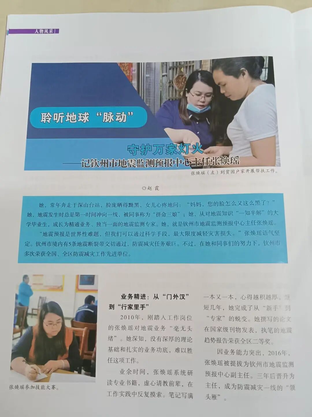 因业务能力突出,2016年,张焕瑶被提拔为钦州市地震监测预报中心副主任。三年后晋升为主任,成为防震减灾一线的“领头雁”。