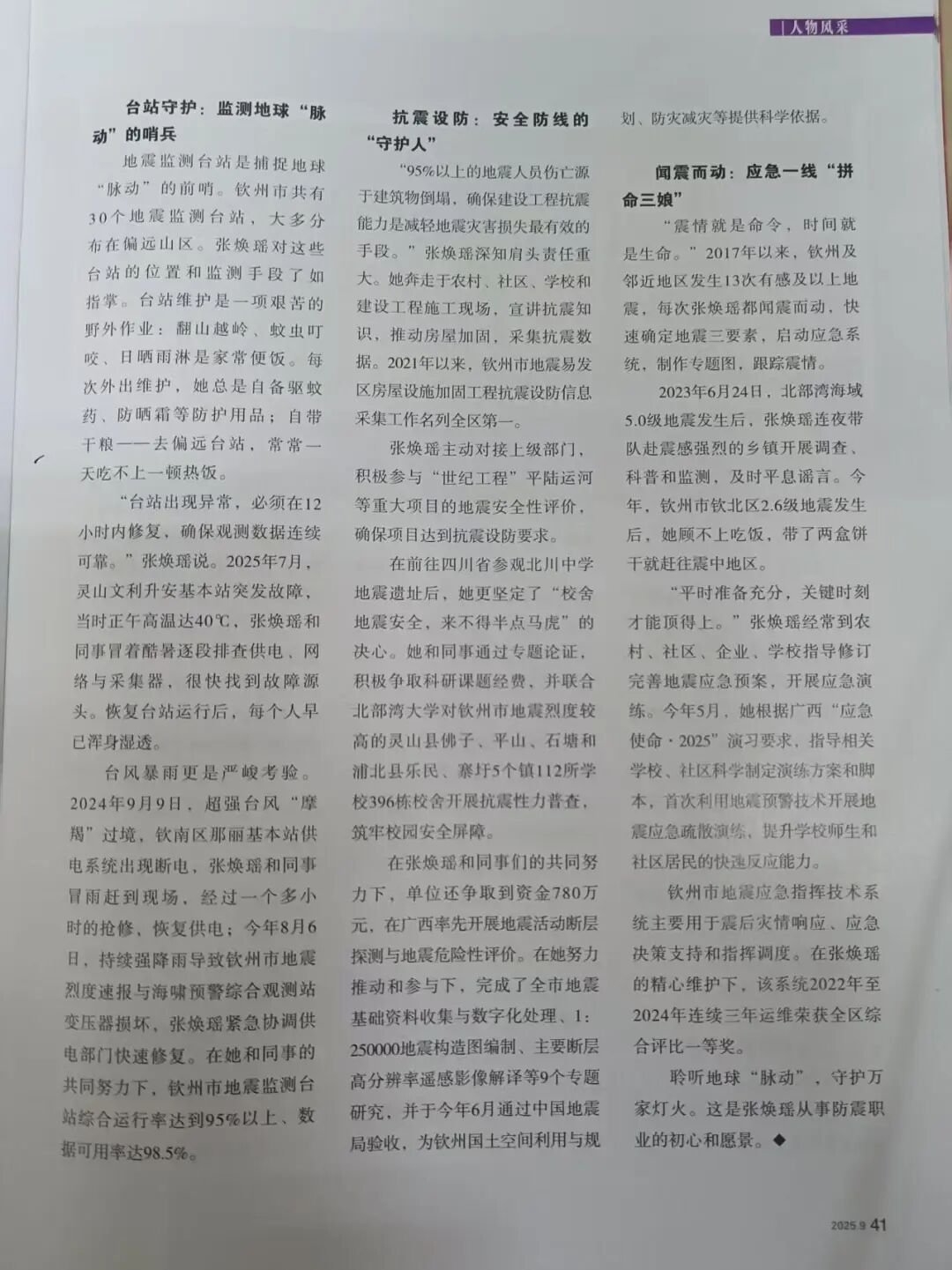 “地震预报是世界性难题,但我们可以通过科学手段,最大限度减轻灾害损失。”张焕瑶语气坚定。钦州市境内有5条地震断裂带交切通过,防震减灾任务艰巨。不过,在她和同事们的努力下,钦州市多次荣获全国、全区防震减灾工作先进单位。