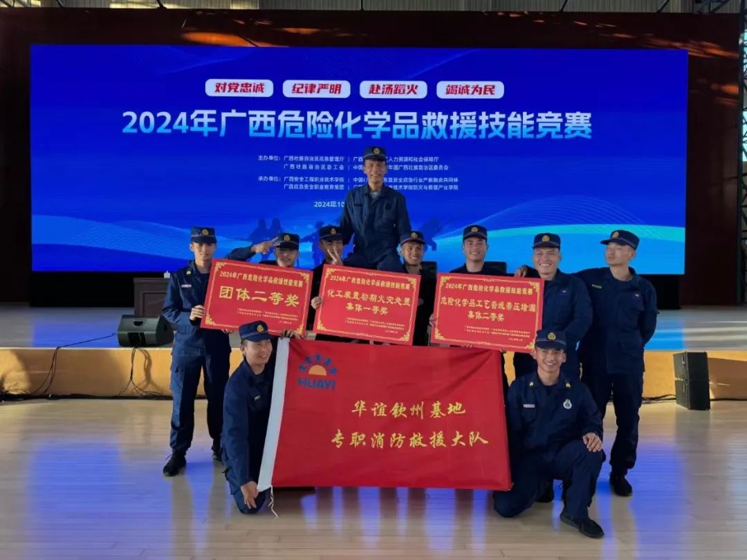 10月24日至25日,广西危险化学品救援技能竞赛在广西安全工程职业技术学院举行。自贸区钦州港片区应急管理局组织广西华谊钦州基地专职消防队参赛,荣获了化工装置初期火灾处置集体一等奖、危险化学品工艺管线带压堵漏集体二等奖和团体二等奖的优异成绩。