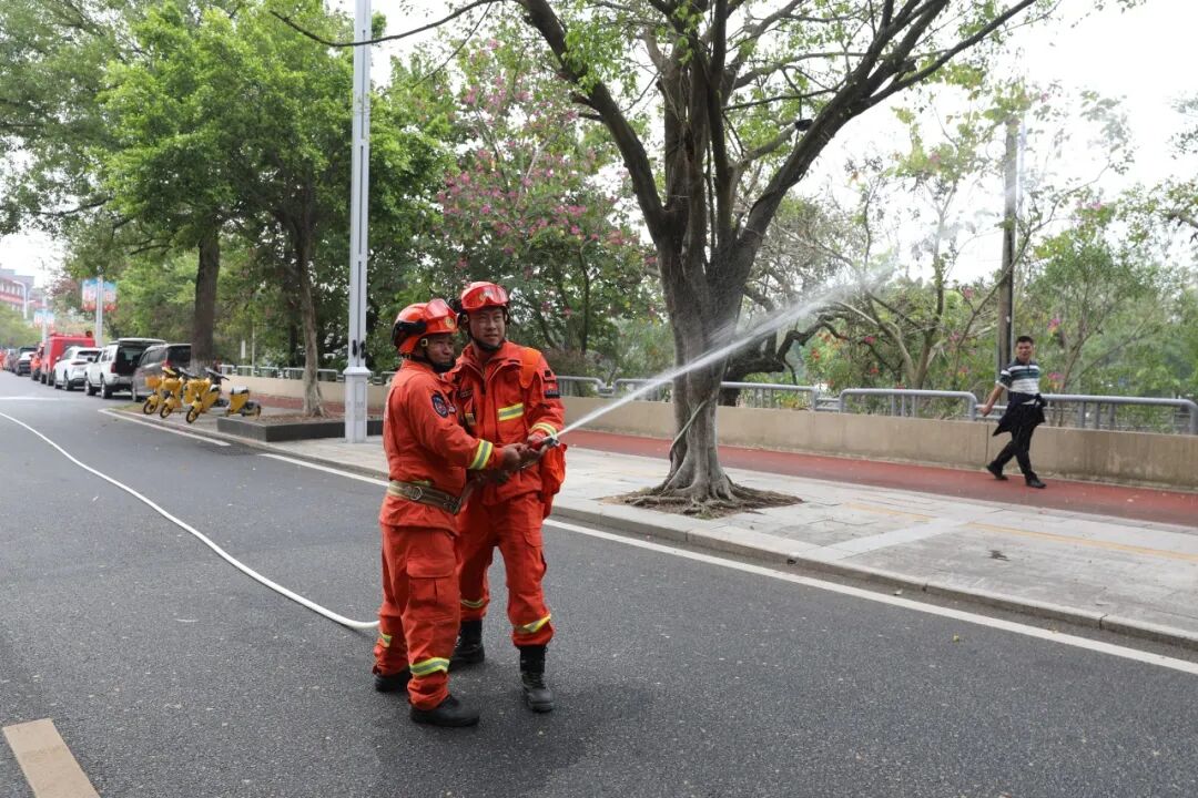 随后,开展森林灭火实战应急演练。风力灭火机演练区,队员们3人组成一组,以砖头模拟火场火点,通过吹动砖头练习精准扫射、火头压制等灭火操作;高压接力消防水泵演练中,队员们快速完成设备组装、多泵接力供水,精准将水柱喷射至模拟火点,通过实战化操作让队员们快速掌握以水灭火核心技能。