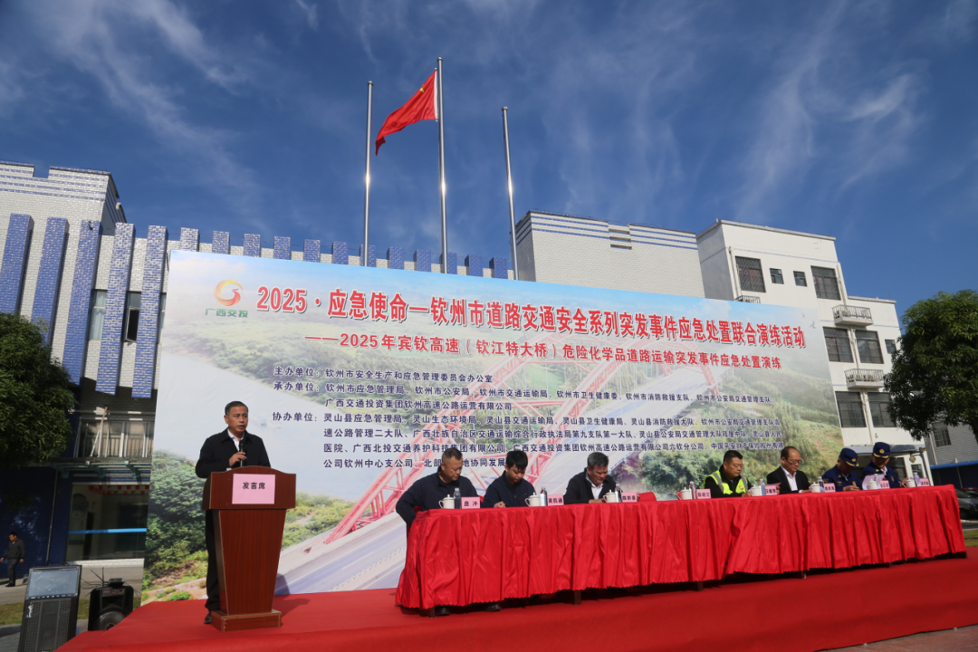 11月13日上午,钦州市安全应急委办公室组织市应急管理局、公安局、交通运输局、卫生健康委、消防救援支队、生态环境局等安全应急委成员单位,以及广西交通投资集团钦州高速公路运营有限公司等多家重点企业,在灵山县陆屋镇宾钦高速钦江特大桥处开展危险化学品道路运输突发事件应急处置演练,由此拉开2025·应急使命—钦州市道路交通安全系列突发事件应急处置联合演练活动序幕。
