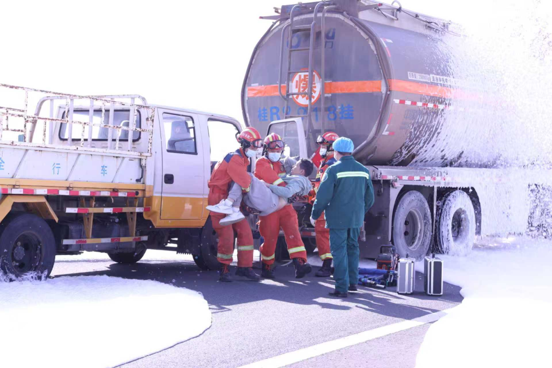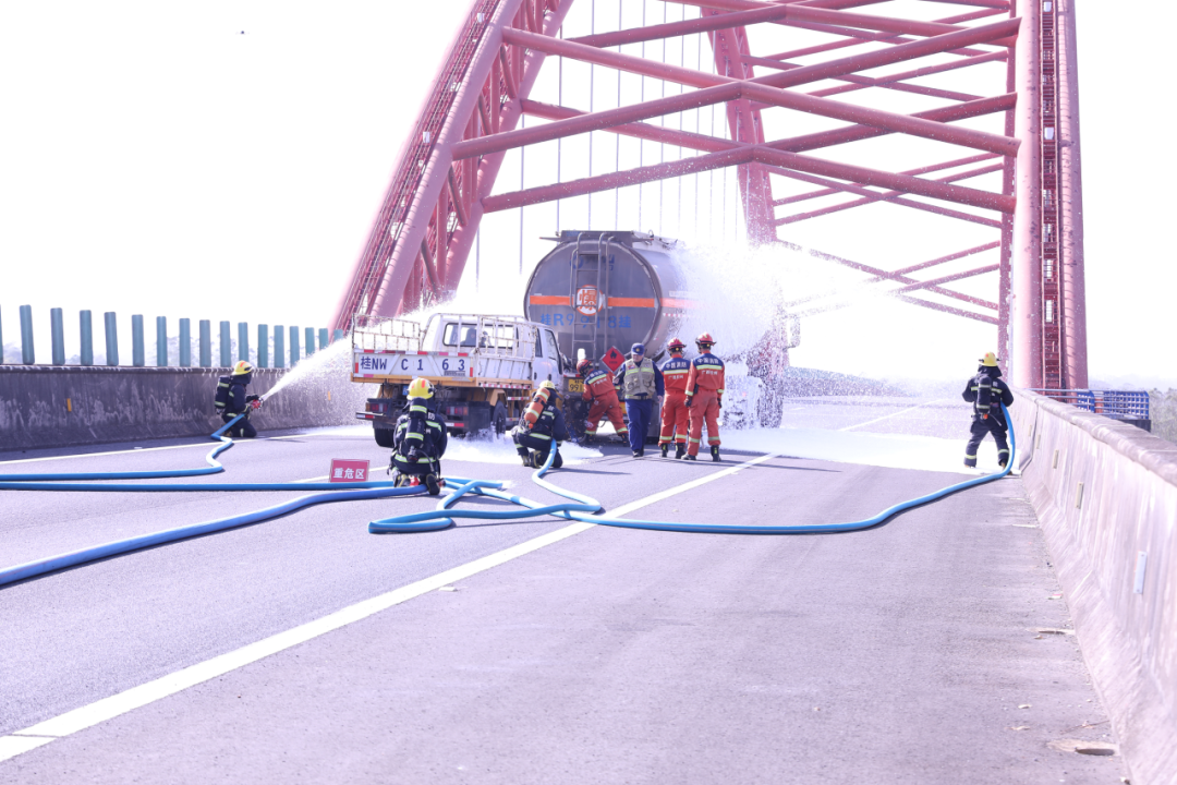 “报告总指挥,宾钦高速钦江特大桥中段,一辆模拟运输易燃液体的槽罐车发生‘追尾事故’,造成‘阀门破损’,部分‘危化品泄漏’,现场有‘人员受伤’,情况危急!”随着模拟险情报告传来,应急演练总指挥一声令下,各参演单位闻令而动,按照应急预案迅速进入实战状态。交警部门率先抵达现场,立即实施交通管制;消防救援支队的重型防化消防车呼啸而至,全副武装的消防指战员迅速展开应急处置和救援行动;医护人员在安全区迅速设立临时救护点,对消防队员救出的“伤员”进行检伤分类和救治;生态环境局的应急监测车迅速就位,实时监控污染物扩散情况;交通运输局协调的吊车、拖车以及危化品转运槽车候命在安全区域,现场险情排除后,立即进场对事故车辆进行起吊、扶正,并将罐内剩余“危化品”安全转移,快速清障,交通恢复正常。