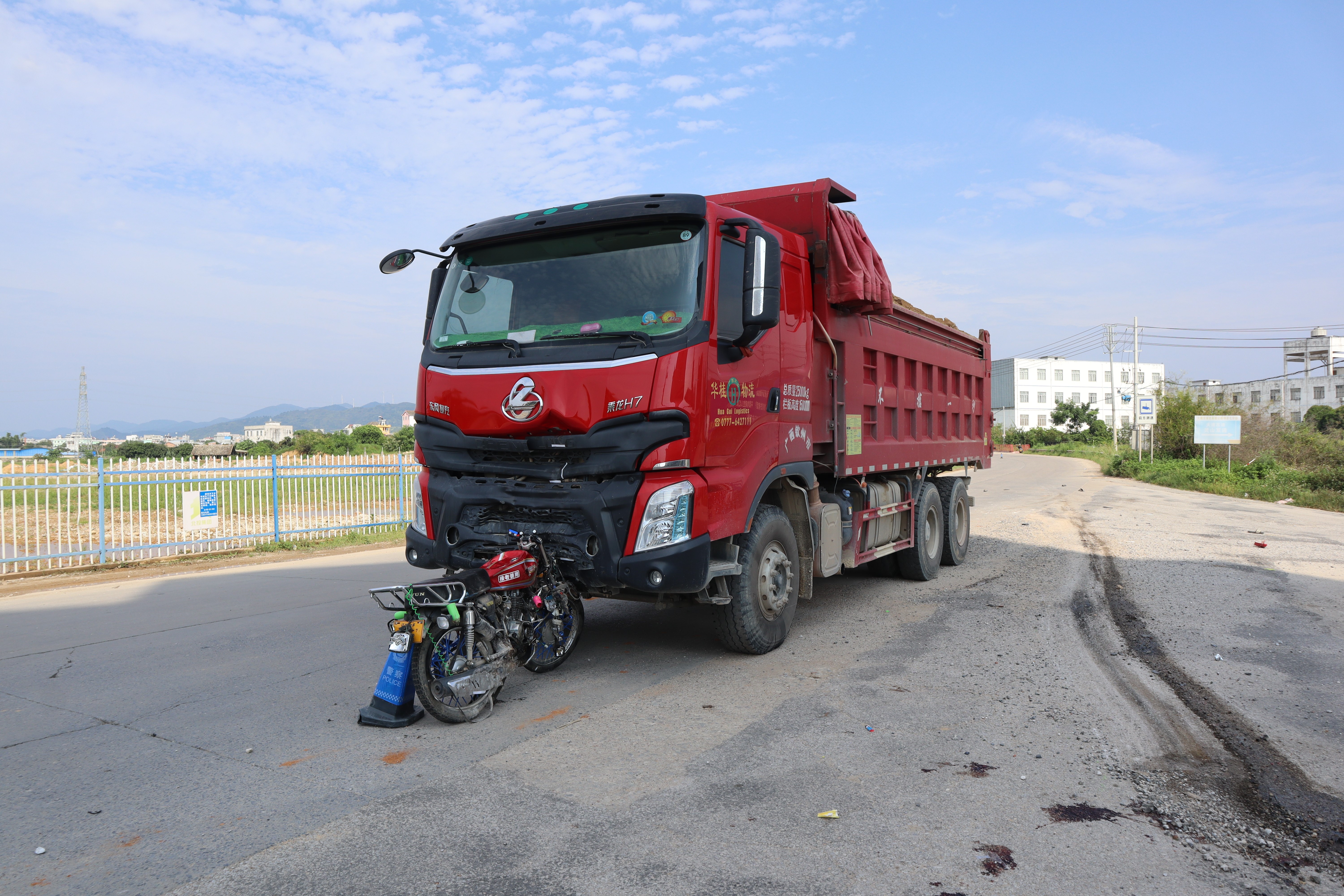 2021年8月3日13时许,在灵山县辖区国道G359线595公里加100米处发生一起一辆重型自卸货车与一辆无号牌普通二轮摩托车相撞的道路交通事故,造成无号牌普通二轮摩托车驾乘人员3人当场死亡,两车不同程度损坏,直接经济损失162.2万元(含事故赔偿费用)。